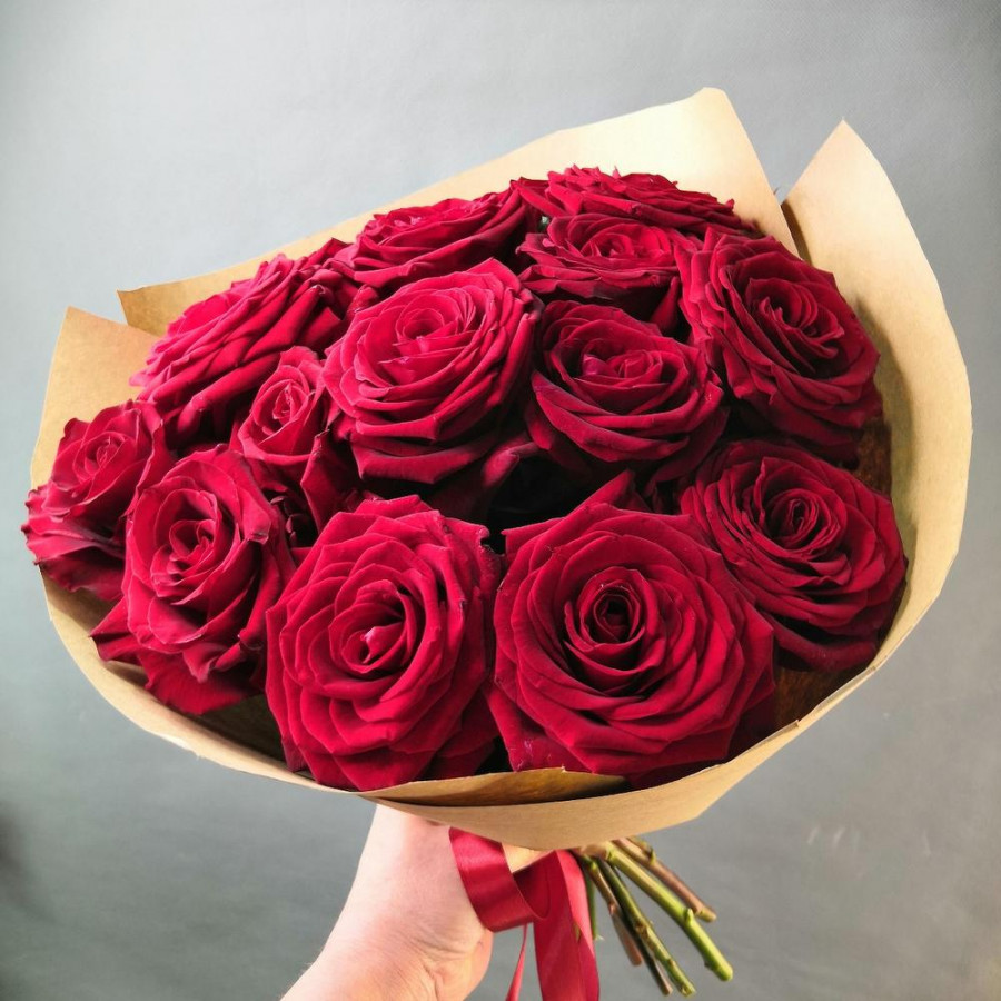 На фото букет из 13 бордовых роз. В составе: роза 13 шт, крафт-бумага 1 шт, атласная лента 1 шт, . Все цветы свежие и ароматные, букет красиво оформлен и отлично подходит для подарка. Доступна доставка цветов или самовывоз.