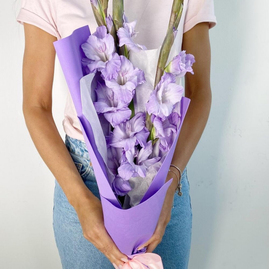 На фото букет из 3 сиреневых гладиолусов. В составе: гладиолус 3 шт, дизайнерская упаковка 1 шт, атласная лента 2 шт, . Все цветы свежие и ароматные, букет красиво оформлен и отлично подходит для подарка. Доступна доставка цветов или самовывоз.