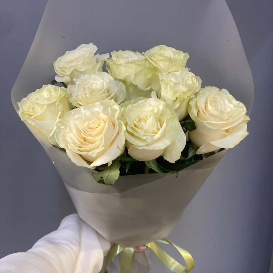 На фото букет из 9 белых роз. В составе: роза 9 шт, дизайнерская упаковка 1 шт, атласная лента 1 шт, . Все цветы свежие и ароматные, букет красиво оформлен и отлично подходит для подарка. Доступна доставка цветов или самовывоз.