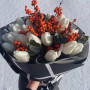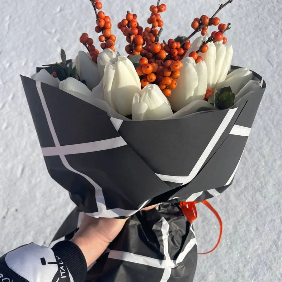 На фото бизнес-букет с белыми тюльпанами. В составе: тюльпан 21 шт, рябина 4 шт, крафт-бумага 1 шт, атласная лента 1 шт, . Все цветы свежие и ароматные, букет красиво оформлен и отлично подходит для подарка. Доступна доставка цветов или самовывоз.