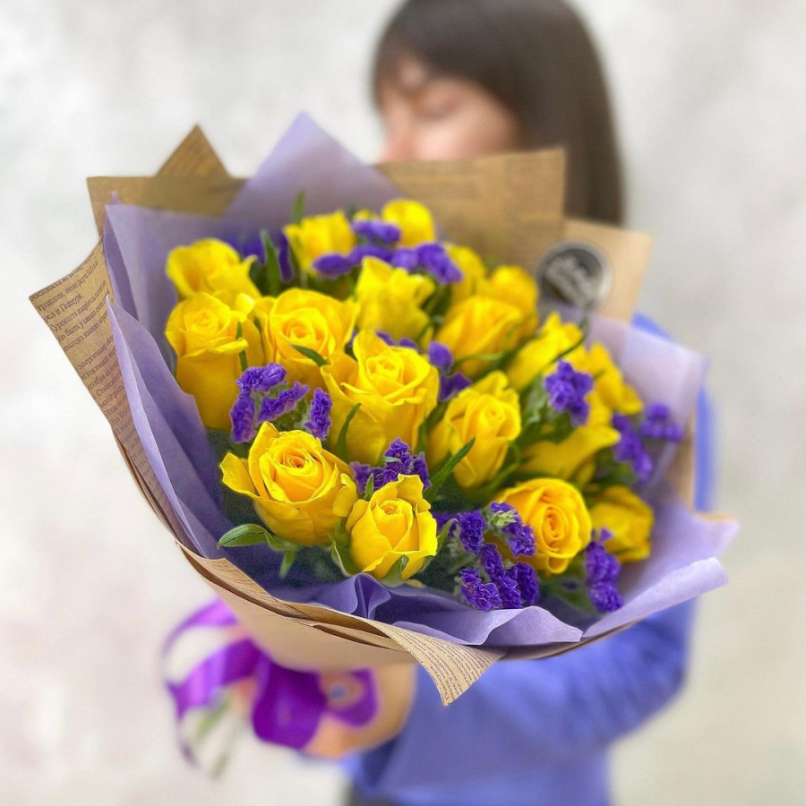 На фото букет из 17 желтых роз и статицы. В составе: роза 17 шт, статица 7 шт, крафт-бумага 1 шт, атласная лента 1 шт, . Все цветы свежие и ароматные, букет красиво оформлен и отлично подходит для подарка. Доступна доставка цветов или самовывоз.
