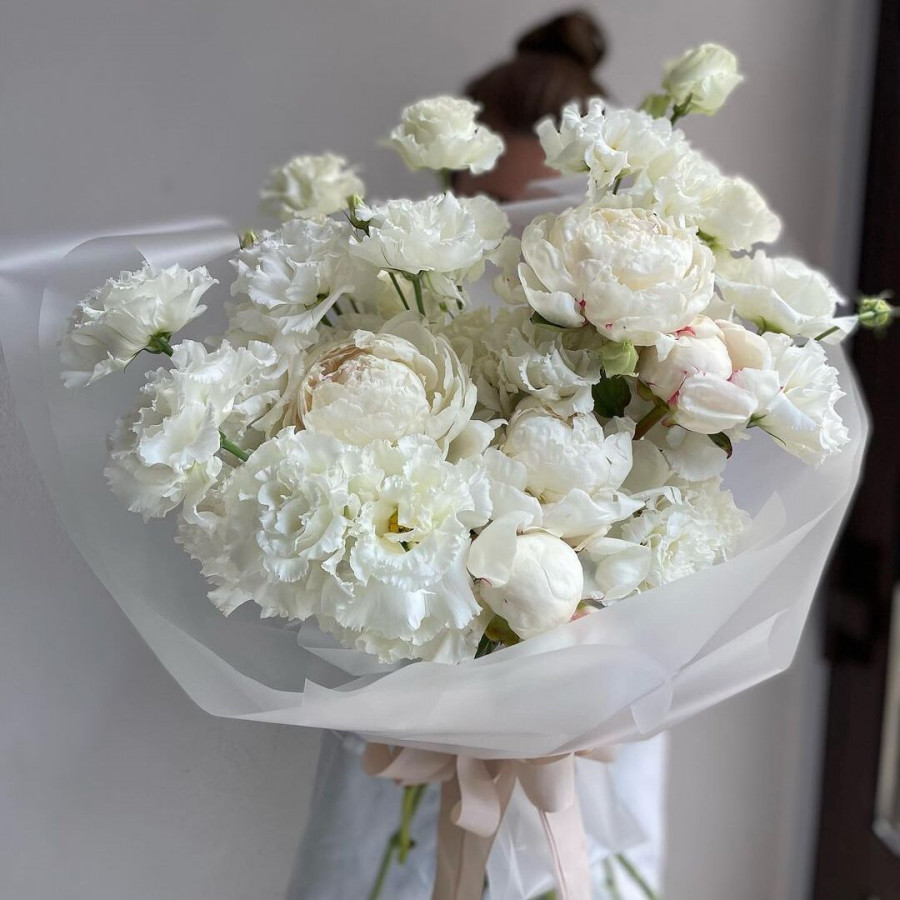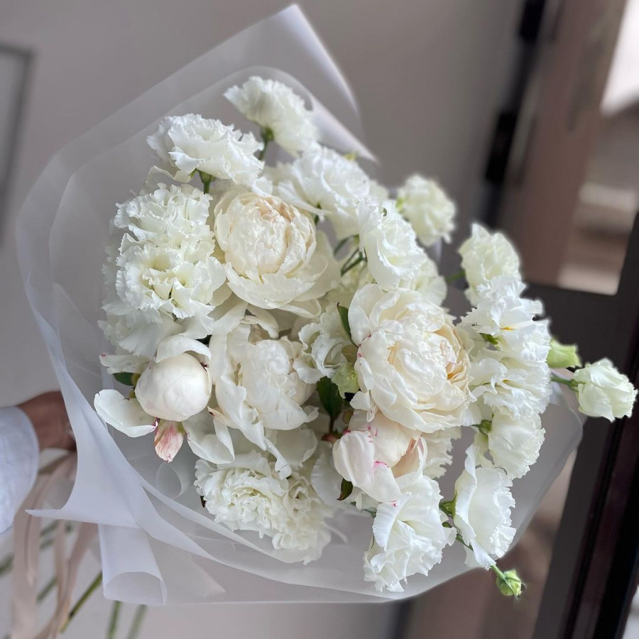 На фото букет из белых пионов и эустомы. В составе: пион 5 шт, эустома (лизиантус) 3 шт, гвоздика 3 шт, крафт-бумага 1 шт, . Все цветы свежие и ароматные, букет красиво оформлен и отлично подходит для подарка. Доступна доставка цветов или самовывоз.