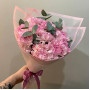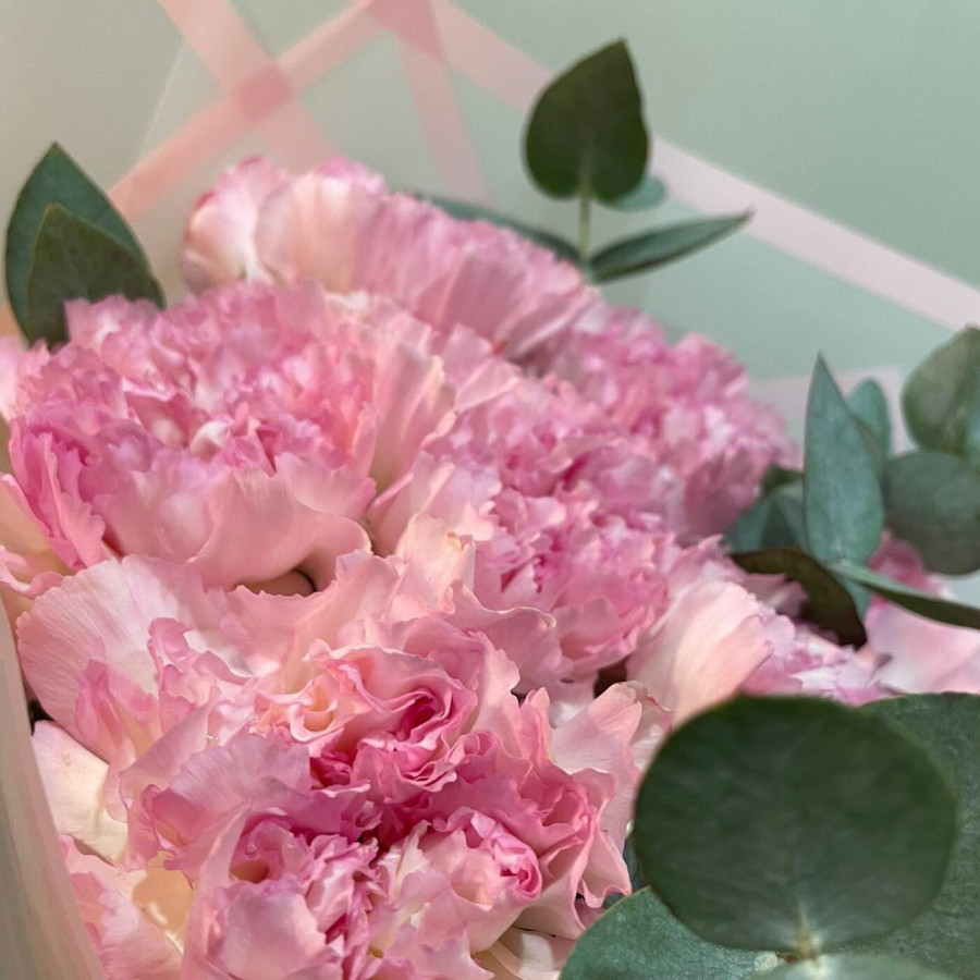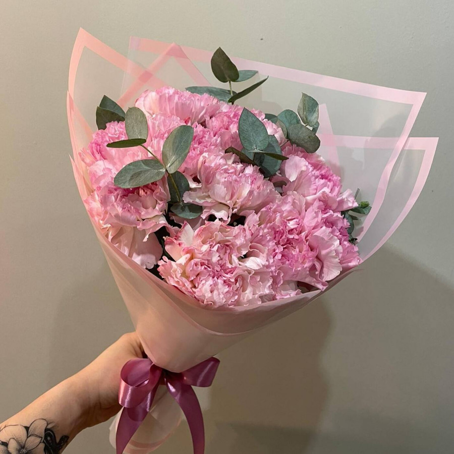 На фото букет из гвоздик с эвкалиптом. В составе: гвоздика 11 шт, эвкалипт 2 шт, крафт-бумага 1 шт, атласная лента 1 шт, . Все цветы свежие и ароматные, букет красиво оформлен и отлично подходит для подарка. Доступна доставка цветов или самовывоз.