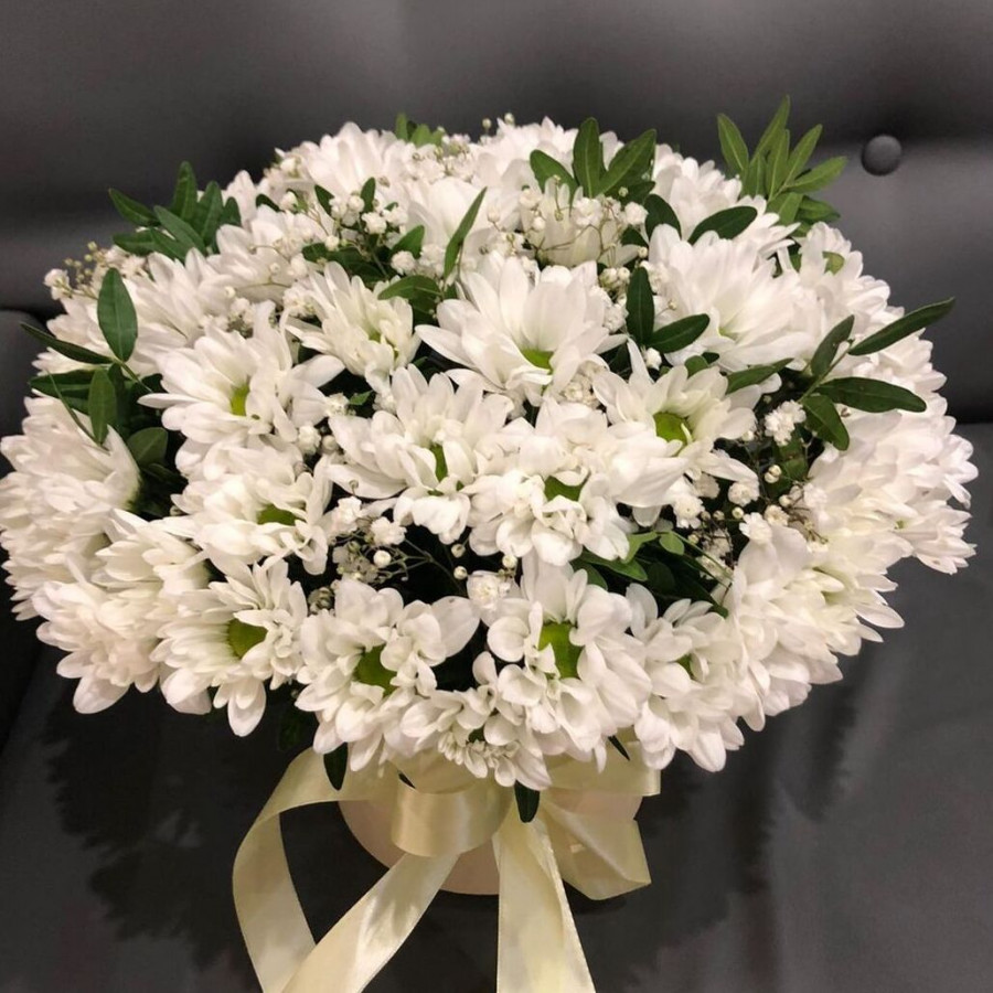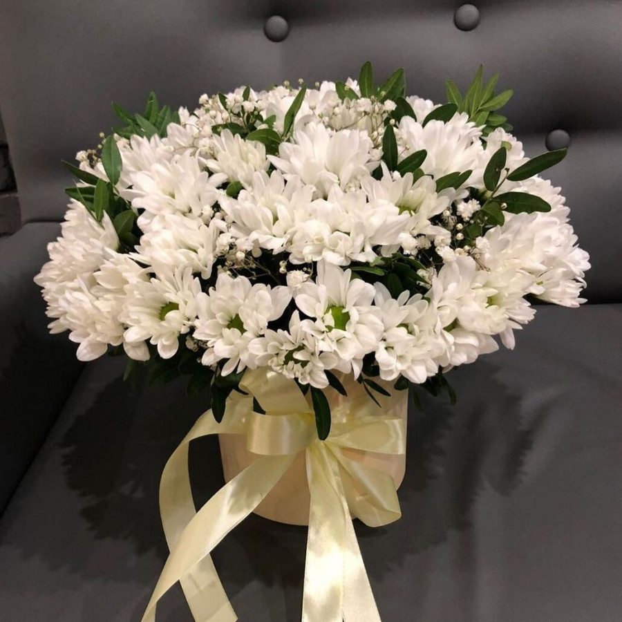 Хризантема белая и гипсофилы в коробке в Сухом Логе